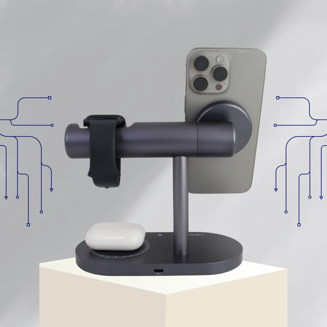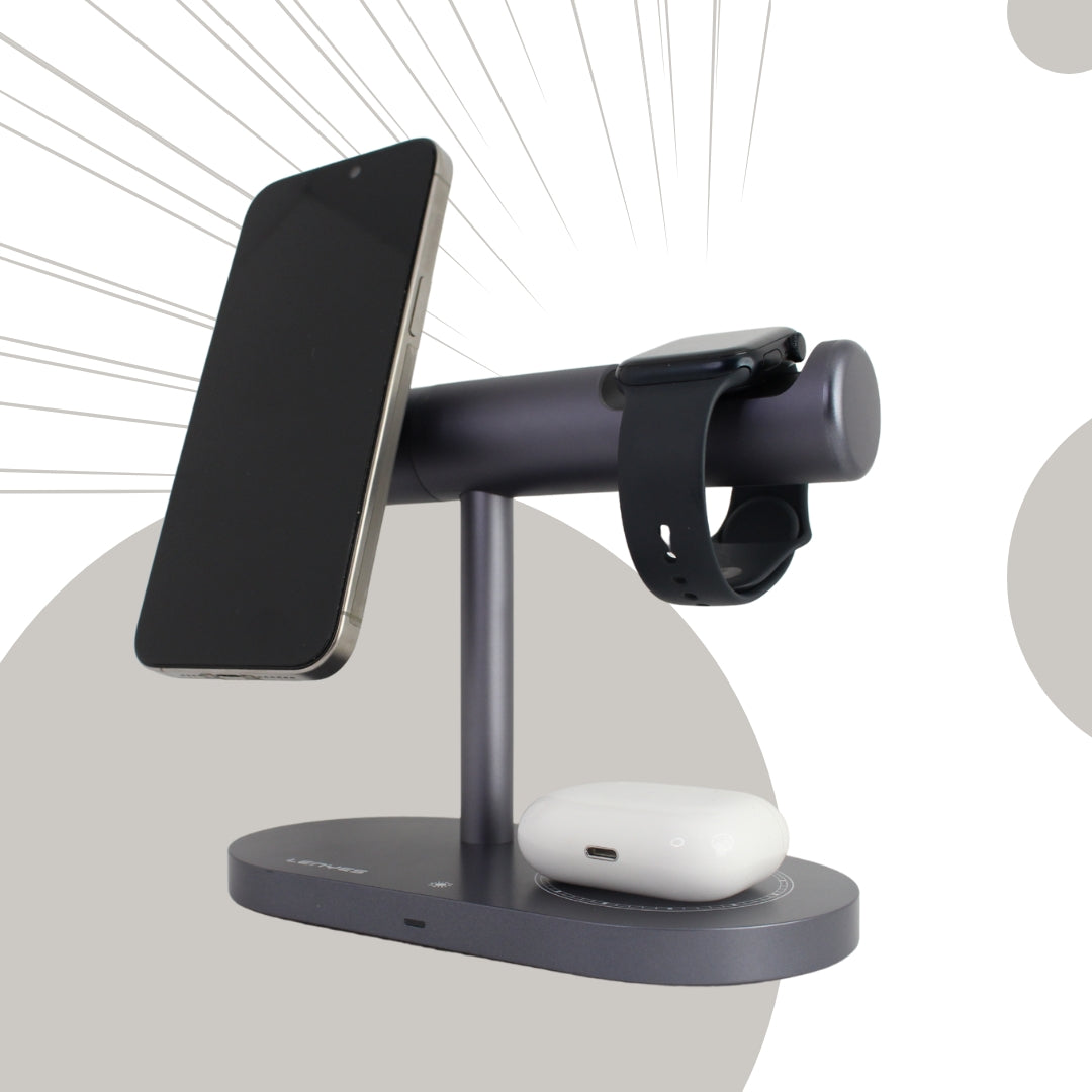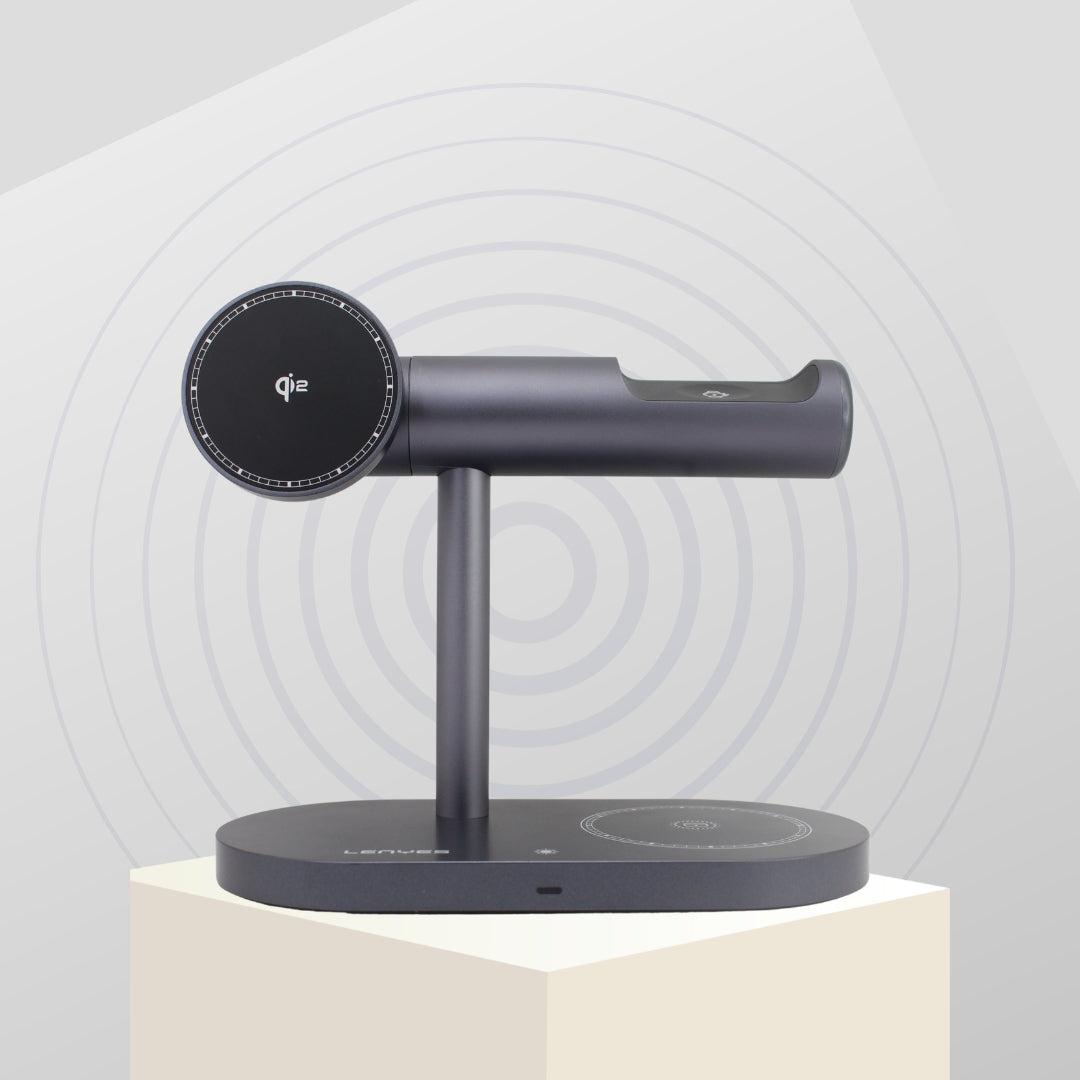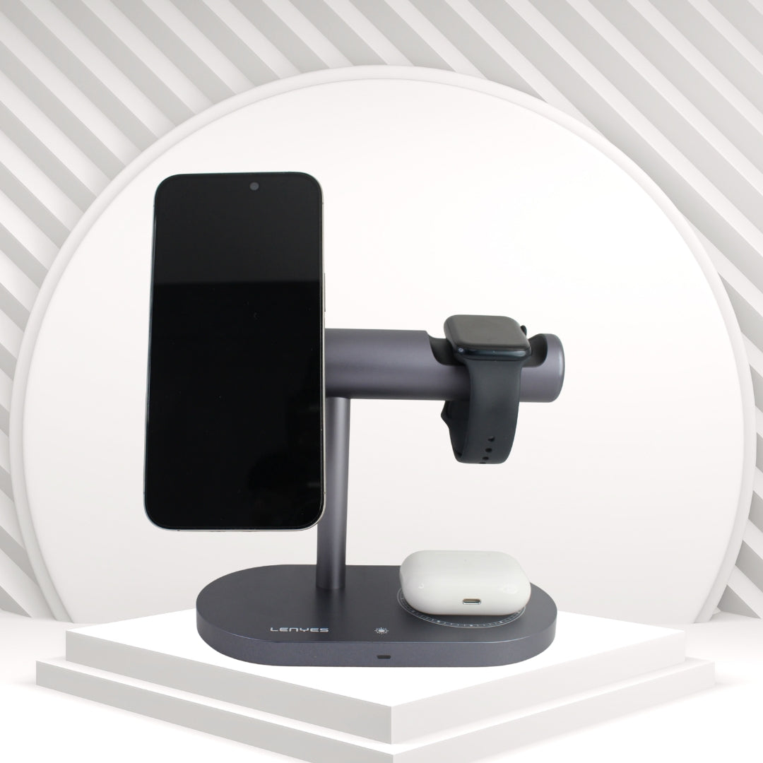 شاحن Lenyes PW319 اللاسلكي المغناطيسي 3 في 1 يجمع بين القوة والتصميم العصري لشحن هاتفك، ساعتك وسماعاتك في وقت واحد وبطريقة آمنة وسريعة.